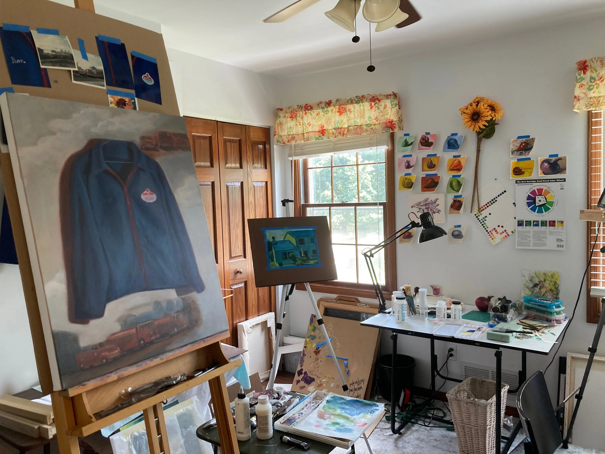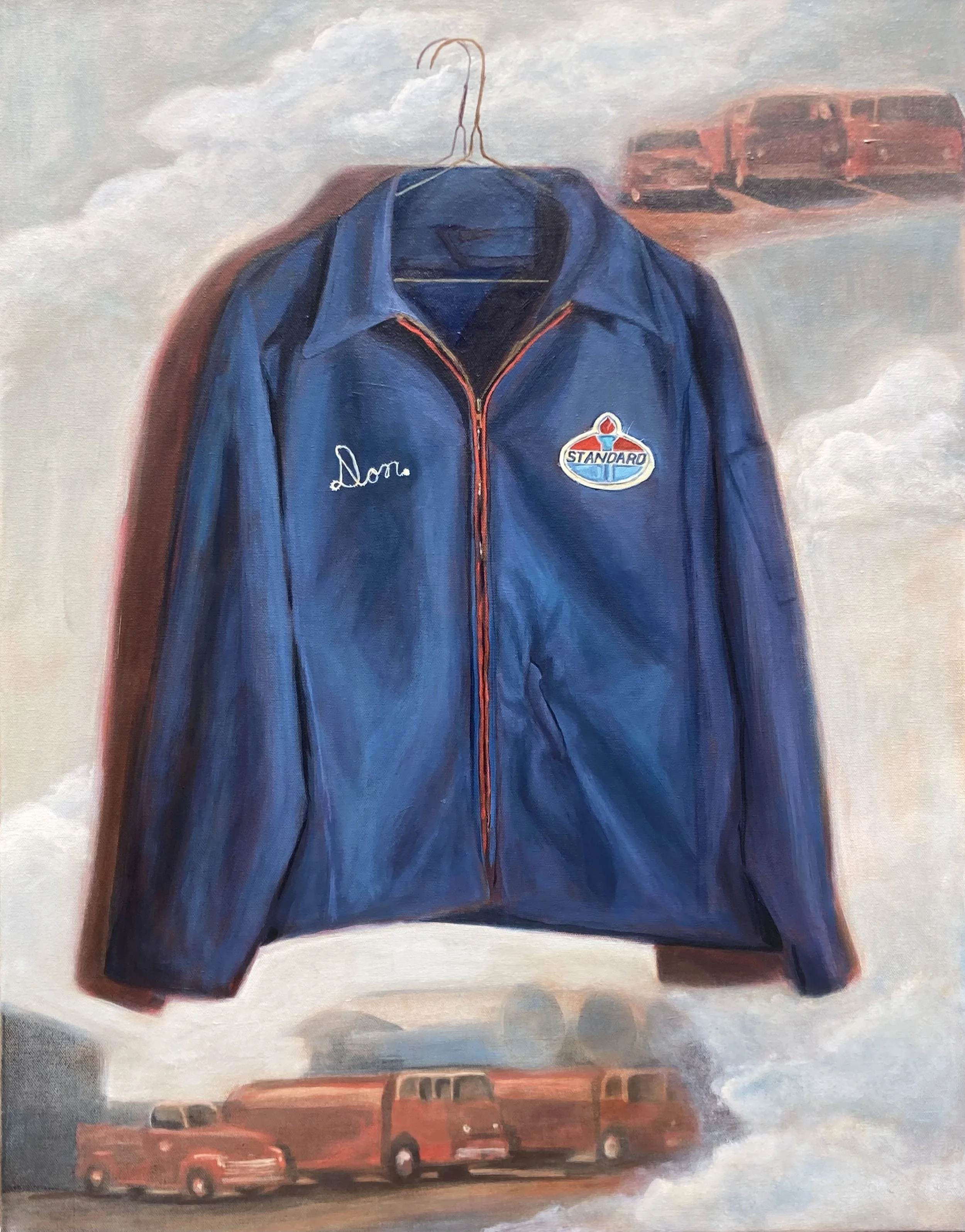 June was marked by a commissioned piece that I take great pride in. After showing my paintings in the Unitarian Church in Geneva, a fellow member saw “Green Farm Coat” and asked me to paint a family heirloom of hers, a blue jacket worn by her grandfather, in a similar style. Her grandfather had worked for Standard Oil and delivered gas and oil to farmers in his community. When we met to discuss the painting, she brought photos, as well as a notepad that had her grandfather’s name on it, which I will be doing a painting of for her, as well. Her excitement, both for my work and for the history of the coat and its owner, revealed to me just how much these objects and stories of the past mean to me, even when they are outside my own family.