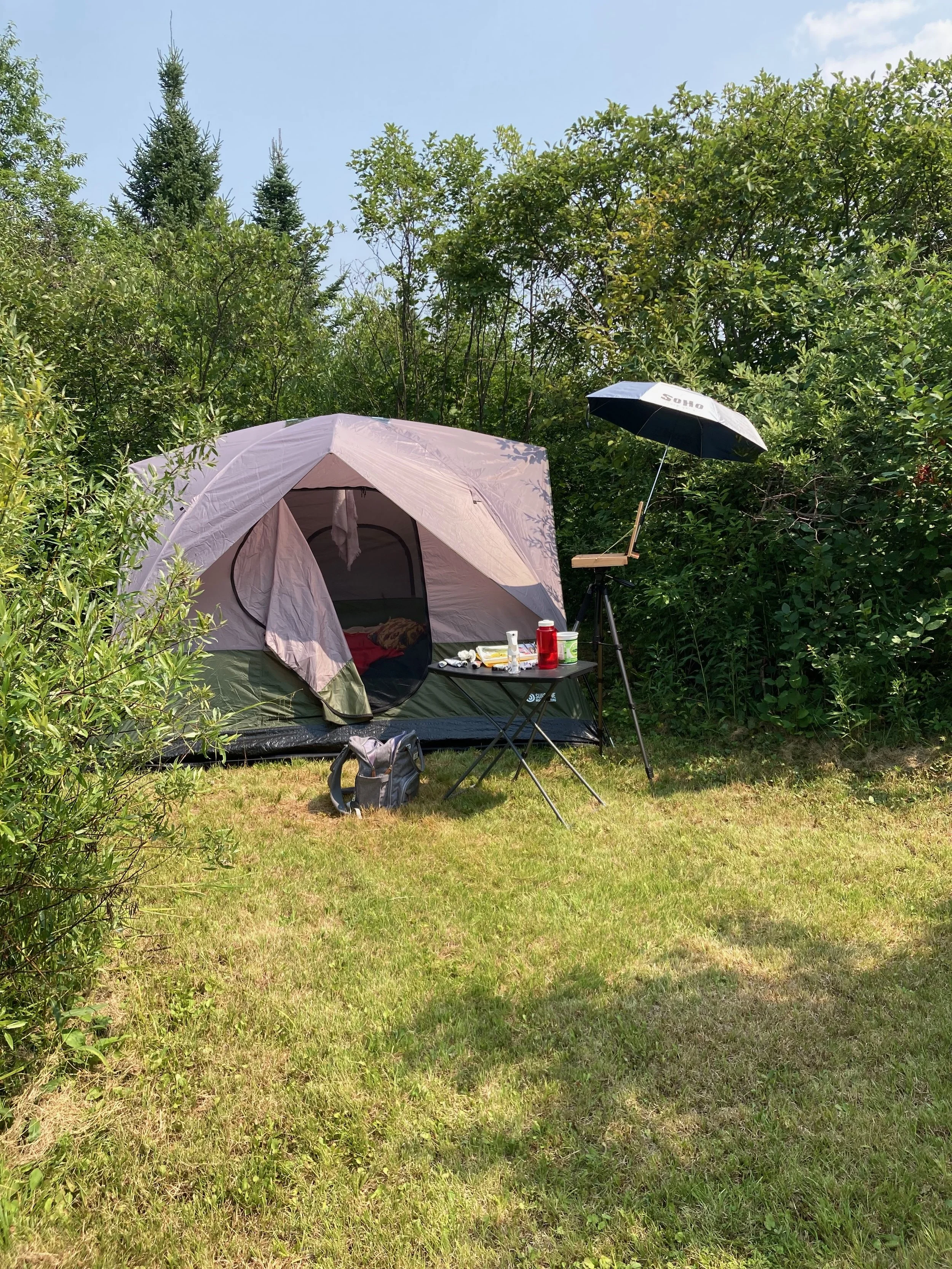 July saw me gearing up for an artist residency at the end of the month, for which I had proposed to paint en plein air everyday. At this point, I had attempted to paint outside only a handful of times, and all of them were pretty unpleasant. Add to this that the residency was a camp, and I’d be living in a tent for two weeks. I certainly found myself wondering if I had gotten in over my head. But I geared up, bought a new tent, a cot, a battery powered air mattress (I needed bed options), and a battery powered fan (I also need moving air). I treated all my clothes with insect repellant, worried daily about tick bites, and tried painting outside a few more times with minor success. Finally, I packed up the car and drove myself the 6 hours up to Ewen, Michigan in the Upper Peninsula, hoping for the best.